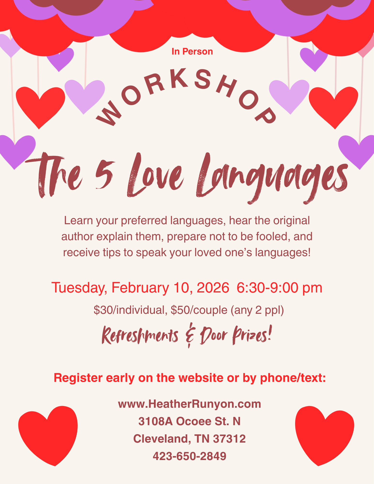 Just in time to make your Valentine’s Day more meaningful! Become equipped to more effectively express your love so that they really feel it. Build lasting, loving relationships. Bring your significant other, come alone, or invite your friends and family. Join us for this 1-night interactive workshop!